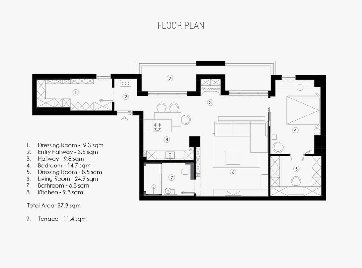 公寓平面圖顯示了一個(gè)寬敞的更衣室,面積為 9.3 平方米,位于入口走廊附近。我們還可以看到主臥室的三面鏡子可以進(jìn)入私人更衣室,更衣室內(nèi)襯壁櫥和化妝臺。